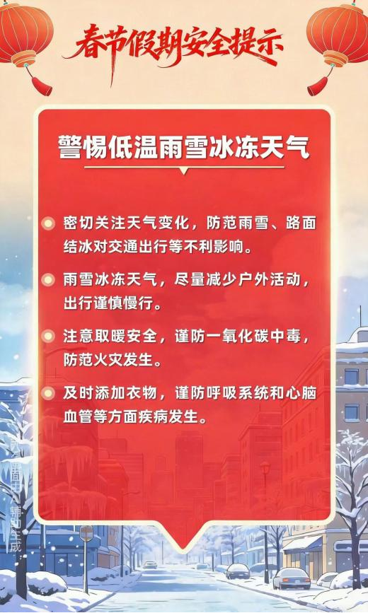 新春佳节来到 用火用气用电增加 出游、出行、运输迎来高峰 灯会、庙会、促销等大型活动多 宾馆、饭店、市场、商超等 场所人流密集 烟花爆竹产销燃放正值旺季 低温雨雪冰冻等恶劣天气多发 各类风险隐患交织叠加 安全工作须臾不可放松 这份春节假期安全提示 请查收 防风险、除隐患、遏事故 平安过春节!!!